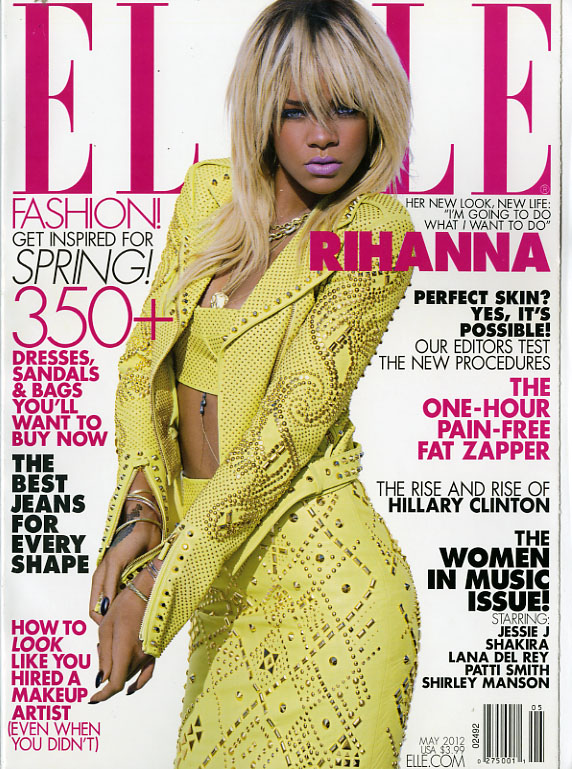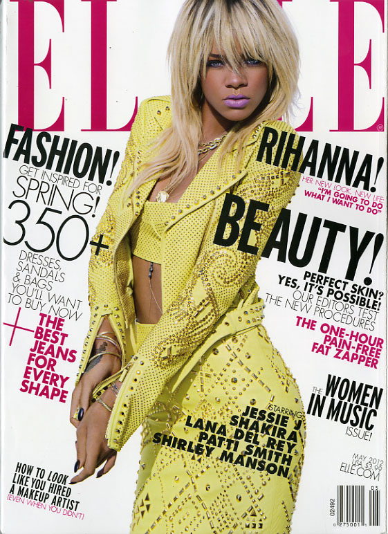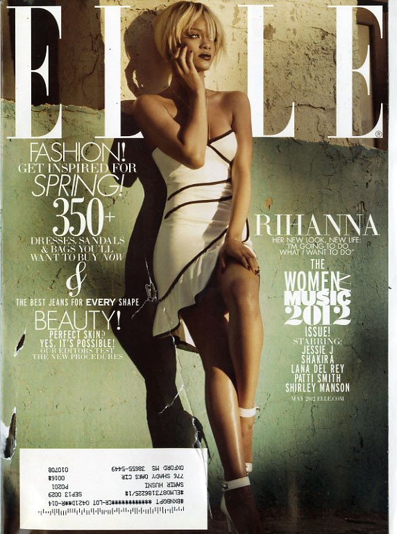 There are three different covers for the May 2012 issue. While all three feature the singer and actress, Rihanna, and the two newsstand issues are very similar, except for the placement and angles of the cover lines; the subscriber’s copy is a totally different entity. The photograph of the singer is far-removed from the mega-entertainer look that she has on the newsstand copies, and the text on the cover is much less spread out and more compact. There are two cover titles missing from the subscriber’s issue also.