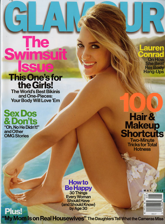 Two different newsstand covers, same model (Lauren Conrad) and same overall look, but very different cover lines. While some of the stories are the same, the words used to describe those articles are very different on each magazine. The only difference for Glamour: the cover lines.