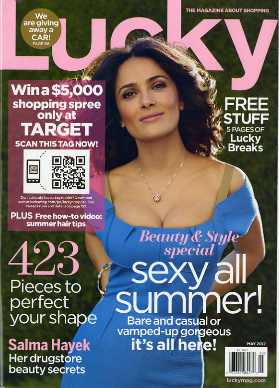 Two different newsstand covers. Salma Hayek graces both covers, but one issue offers a tag the consumer can scan at Target to win a $5000 shopping spree. The other offers one different cover line. Everything else is the same.