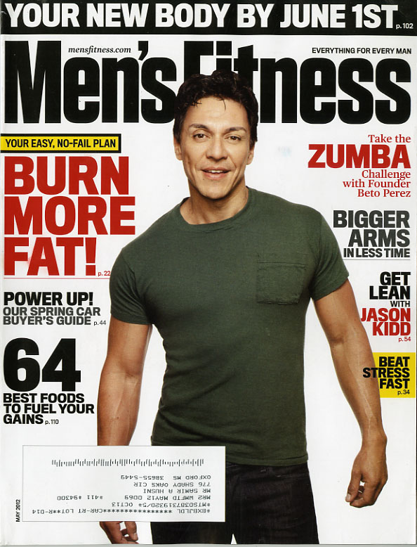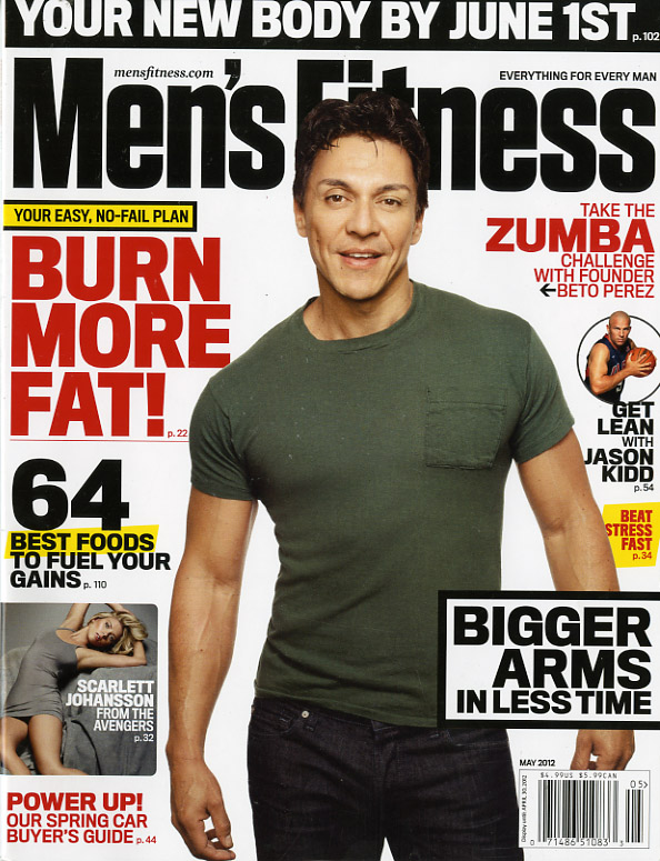 Two covers this issue, one for the subscriber, the other for the newsstands. Both have the very enigmatic Beto Perez, the founder of Zumba, on the cover, but the newsstand issue also has a very provocative, left-corner shot of Scarlett Johansson from The Avengers, while the subscriber’s get only their address label located there. The cover lines are also arranged differently on each magazine, and on the newsstand issue, there is a promo shot of Jason Kidd, and the command to “Get Lean” with him. The story “Bigger Arms in Less Time” is more predominantly featured on the newsstand issue, and there is an identifying arrow pointing toward Perez that is missing from the subscriber’s, as well.