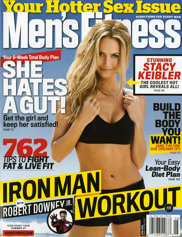 Two covers for June, subscriber and newsstand. Newsstand gets the promise of “Your Hotter Sex Issue,” while the subscriber gets “Ripped in Six Weeks.” The cover story about Stacy Keibler is the same, except for color and font size (her name is bigger and in red on the newsstand issue and the title is done in white, versus black on the subscriber’s copy).
