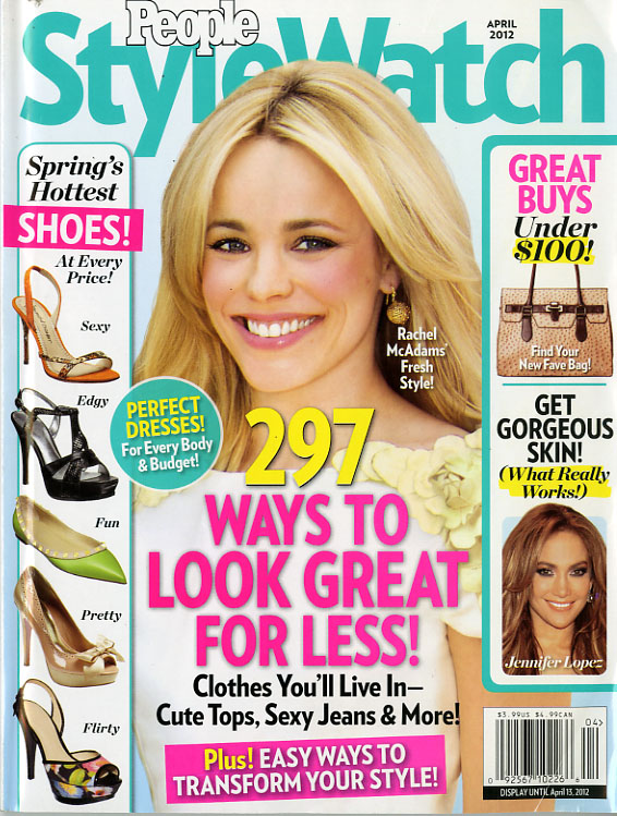 There are two different covers for this magazine. The differences easily detected are the name, stretched across the top on one, and broken apart and stacked on the other cover. A $1 off coupon is attached on one and also has the tantalizing offer of “Exclusive Discounts for You!” where the other magazine has neither. The feature story is presented in a different placement as well, on one it is centered, midway the page, and the other cover has it aligned left, yet far enough from the edge to allow for the same sidebar story on Spring’s Hottest Shoes, while it still holds the midway spot.
