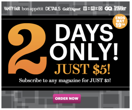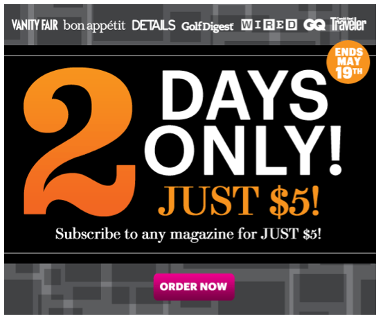 The magazine business model drama continues… It is amazing that after all this talk about the new magazine business model and how it is going to be more “consumer centric,” to receive offers to subscribe to some great-name-brand magazines for a mere $5.00 for five or six issues (That is at least 80% discount of the cover price). There is no need to blame customers and consumers for the decline in single copy sales, and there is no need to blame the tablets for that decline either. There is no one to blame but the magazine publishing industry itself. Publishers willing to sell a magazine like Wired, Vanity Fair or GQ for a mere $5.00 for the entire year, need to blame no one but themselves if their newsstands sales are declining. For the magazine industry to survive and thrive we have to start charging the fair value for the content and experience magazines deliver, whether on the newsstand, digital or by subscription. Otherwise, if we continue to be in the business of counting customers and not the business of customers who count, the magazine business can easily see the writing on the wall… and that writing is NOT good news! Take a look at the latest offer that arrived in my inbox this morning…