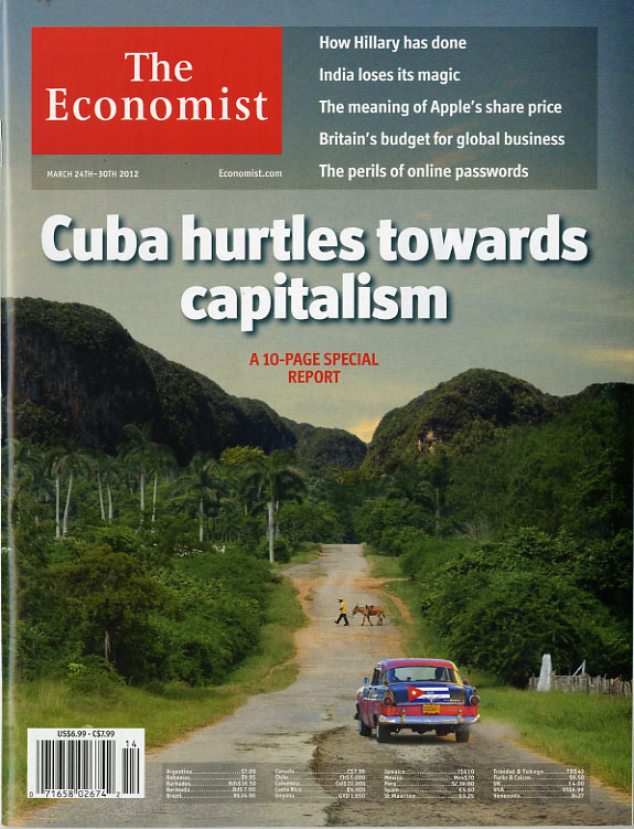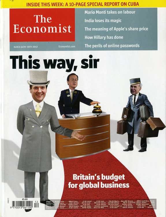 Two newsstand covers. One is the US edition, which has a cover story about Cuba; the other is the UK version and has a story about Britain’s budget for global business. The British edition includes the Cuba story in one of its cover lines, as does the American version with the British budget story. Other than a piece on Mario Monti in the UK edition, all the other cover lines are the same.