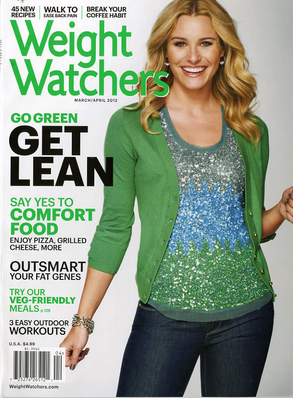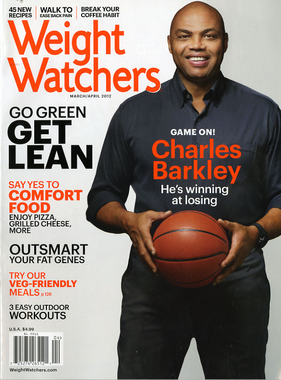 This issue of Weight Watchers has two covers. One has Charles Barkley, with the color orange (possibly due to the basketball in Barkley’s hands) used to highlight certain words on the page, and the other cover is a slim, attractive young woman wearing a green sweater, with a coordinating sequined top beneath. Green is the chosen color on this cover, with the highlighted words inviting us to do as the main story suggests: Go green, get lean. Inside the cover, on the table of contents, Weight Watchers calls the reader’s attention to the fact that there are two covers and invites consumers to respond with an e-mail as to which one they prefer.