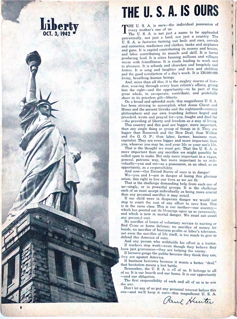 THE U.S.A. is not just a name to be applauded patriotically, not just a land, not just a country. The U.S.A. is factories turning out beds and cars, cereals and cosmetics, medicines and clothes, tanks and airplanes and guns. It is capital contributing its money and brains, and labor contributing its muscle and skill. It is farms producing food. It is cities housing millions and villages warm with friendliness. It is roads leading to work and to pleasure. It is schools and churches and hospitals and homes. It is song and laughter and love and children and the good satisfaction of a day’s work…