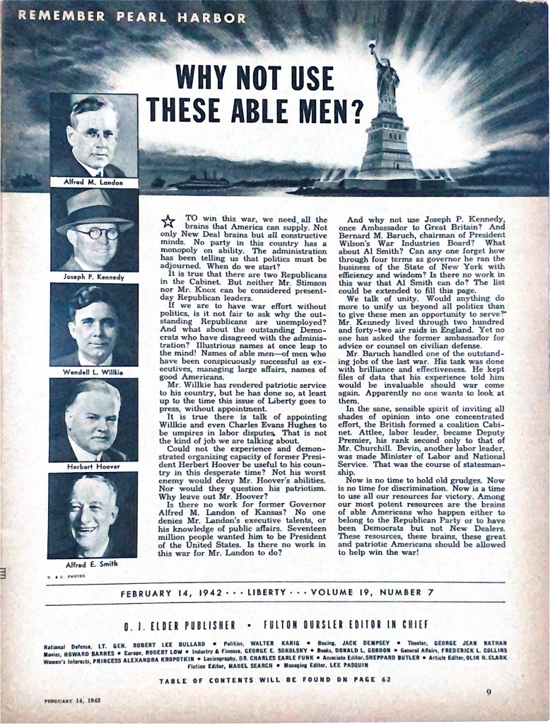 TO win this war, we need all the brains that America can supply. Not only New Deal brains but all constructive minds. No party in this country has a monopoly on ability. The administration has been telling us that politics must be adjourned. When do we start?…