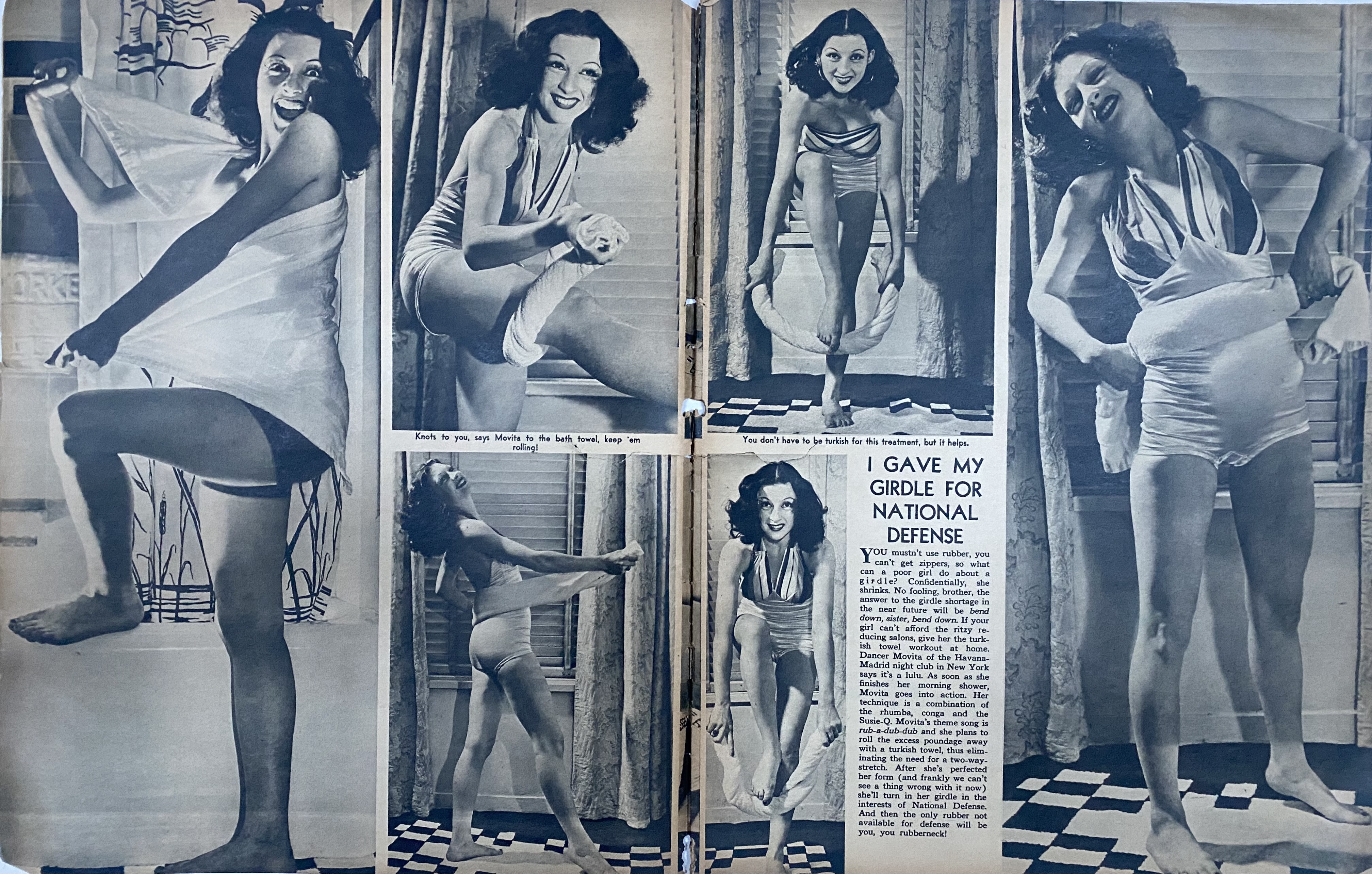 You mustn’t use rubber, you can’t get zippers, so what can a poor girl do about a girdle? Confidentially, she shrinks. No fooling, brother, the answer to girdle shortage in the near future will be bend down, sister, bend down. If your girl can’t afford the ritzy reducing salons, give her the turkish towel workout at home. Dancer Movita of the Havana-Madrid night club in New York says it’s a lulu. As soon as she finishes her morning shower, Movita goes into action. Her technique is a combination of the rhumba, conga and the Susie-Q. Movita’s theme song is rub-a-dub-dub and she plans to roll the excess poundage away with a turkish towel, thus eliminating the need for a two-way-stretch. After she’s perfected her form (and frankly we can’t see a thing wrong with it now) she’ll turn in her girdle in the interests of National Defense. And then the only rubber not available for defense will be you, you rubberneck!