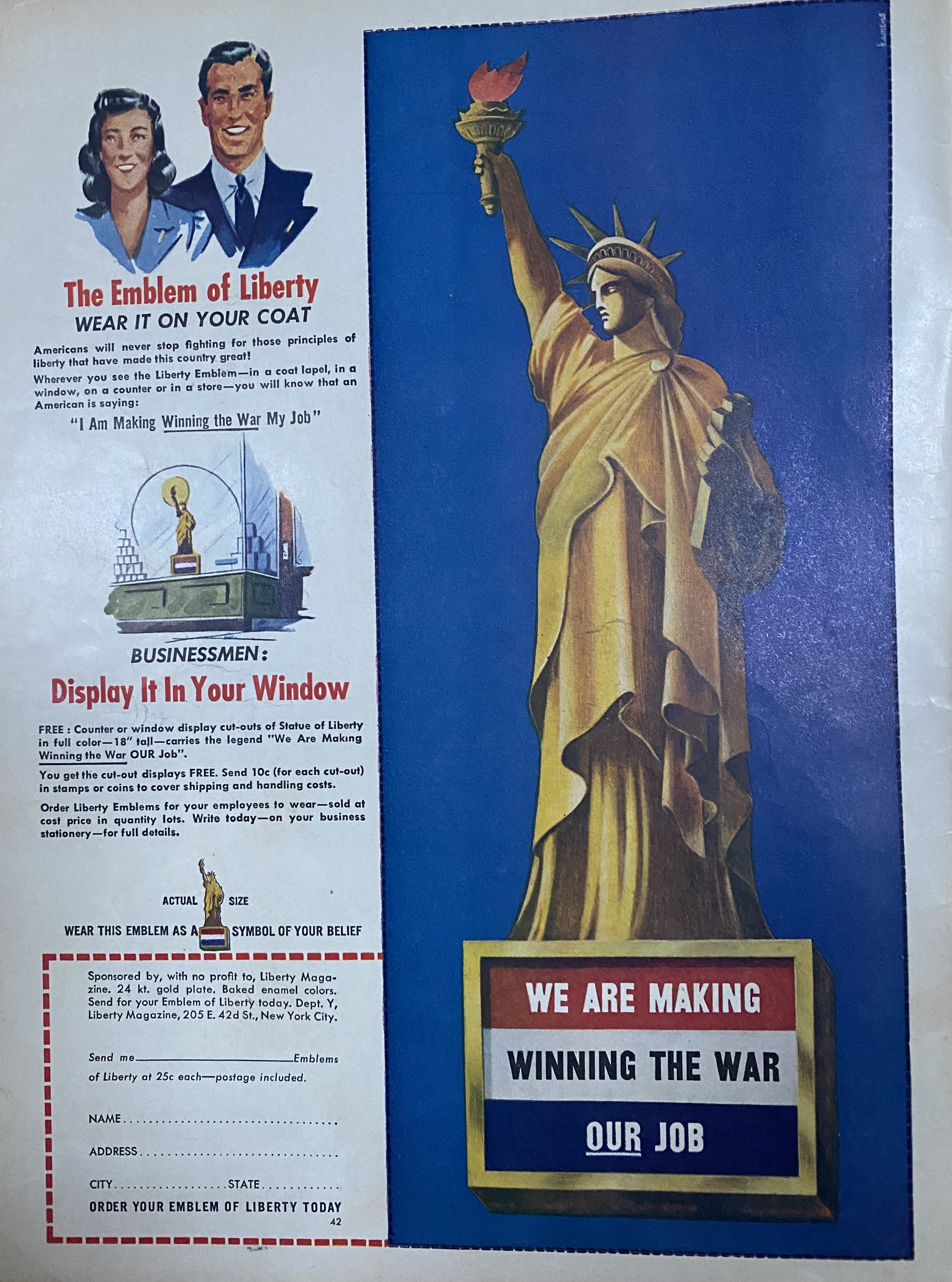Wherever you see the Liberty Emblem – in a coat lapel, in a window, on a counter or in a store – you will know that an American is saying: “I Am Making Winning The War My Job”