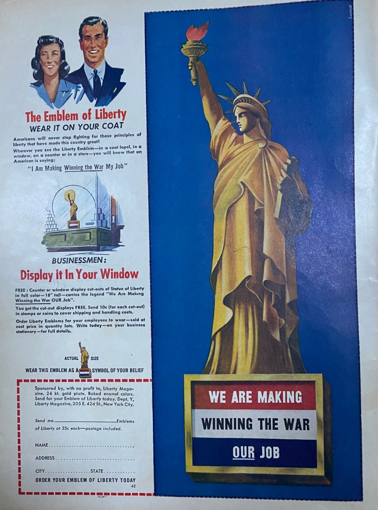 An ad on the inside front cover of the October 3 issue, Liberty magazine offers an Emblem of the Statue of Liberty with the words WE ARE MAKING WINNING THE WAR OUR JOB.